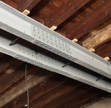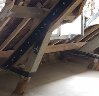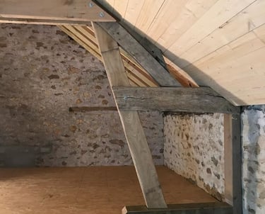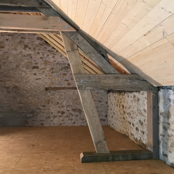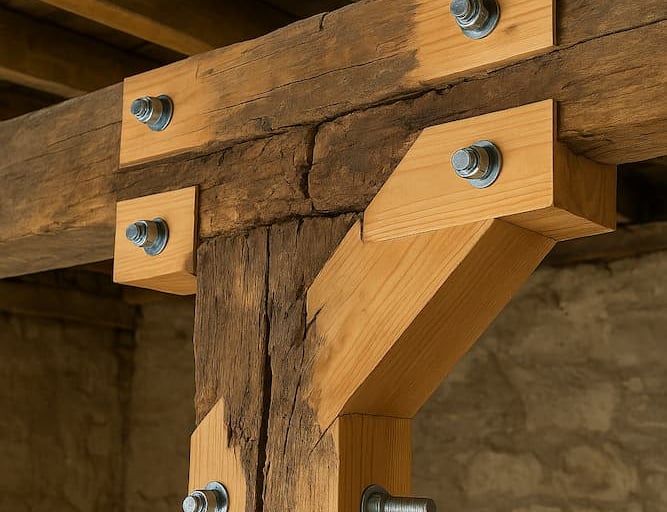 Le moisage est une technique de renforcement qui consiste à "pincer" une pièce de bois affaiblie entre deux éléments neufs (en bois ou en acier). Fixés par boulonnage, ces renforts latéraux reprennent les charges de manière homogène. C'est la solution idéale pour renforcer des solives après la création d'une nouvelle pièce à l'étage ou pour redresser une charpente ancienne.