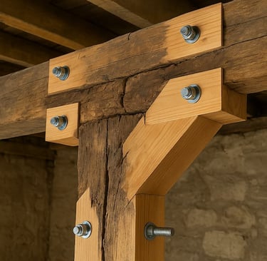 Les extrémités de poutres encastrées dans les murs sont les zones les plus vulnérables à l'humidité. En cas de pourrissement, nous procédons à une reconstitution par résine époxy. Cette technique consiste à purger la partie dégradée et à créer une prothèse structurelle armée de tiges en fibre de verre ou d'acier inoxydable, offrant une résistance supérieure au bois d'origine.